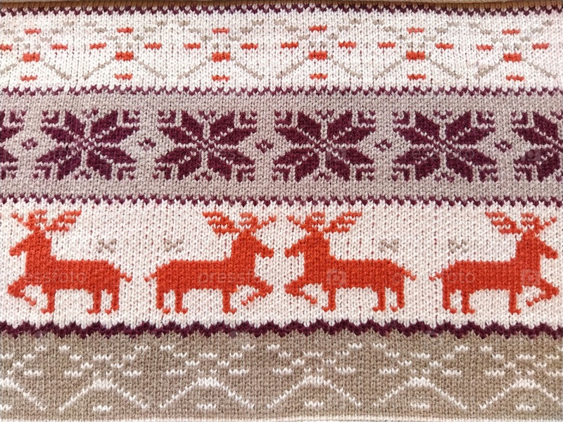 Вязаные узоры со снежинками, оленями, цветами, ломаными полосками. Оранжевые, красно-коричневые, белые, бежевые шерстяные нитки. Народное искусство. Теплый зимний свитер связан лицевыми петлями. Новый год и Рождество