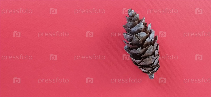 Красивая шишка на красном фоне. Новогодние и рождественские украшения. Ель или сосновая шишка крупным планом. Еловая шишка справа