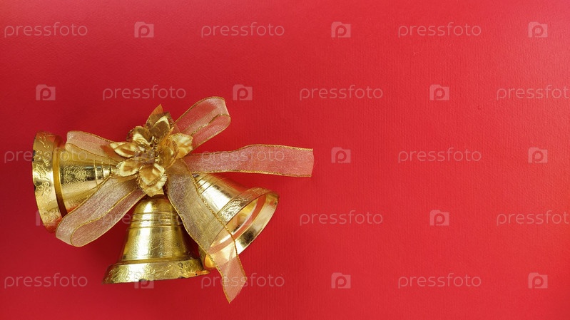 Рождественские украшения. Золотые колокольчики с лентой на красном фоне