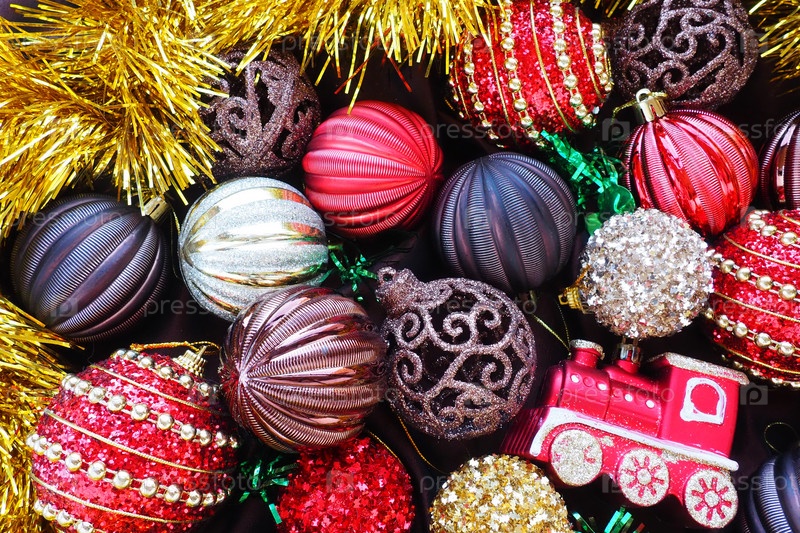 Новогодний фон с желтой мишурой и елочными шарами. Красивые елочные игрушки и украшения. Красные, золотые, коричневые, серебряные, желтые полосатые блестящие шарики. Игрушечный праздничный паровозик