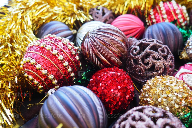 Новогодний фон с желтой мишурой и елочными шарами. Красивые елочные игрушки и украшения. Красные, золотые, коричневые, серебряные, желтые полосатые блестящие шарики. Игрушечный праздничный паровозик