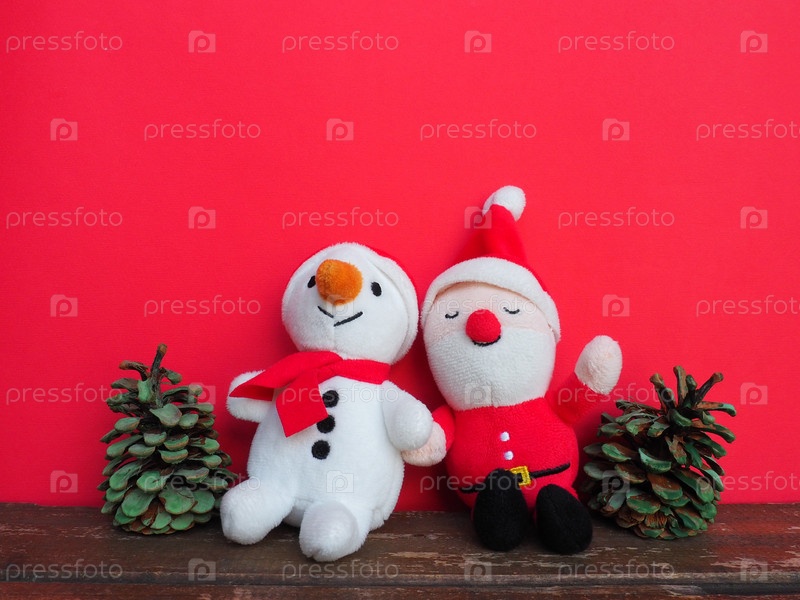 Плюшевые сшитые рождественские мягкие игрушки на красном фоне. Крашеные конусы. Маленький улыбающийся снеговик и забавный Дед Мороз. Канун Нового года и Рождества. Скопируйте пространство. Симпатичные добрые детские игрушки