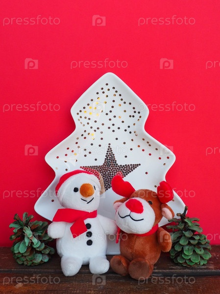 Плюшевые сшитые рождественские мягкие игрушки на красном фоне. Крашеные конусы. Маленький улыбающийся коричневый олень и забавный Санта-Клаус. Канун Нового года и Рождества. Скопируйте пространство. Тарелка в виде елочки