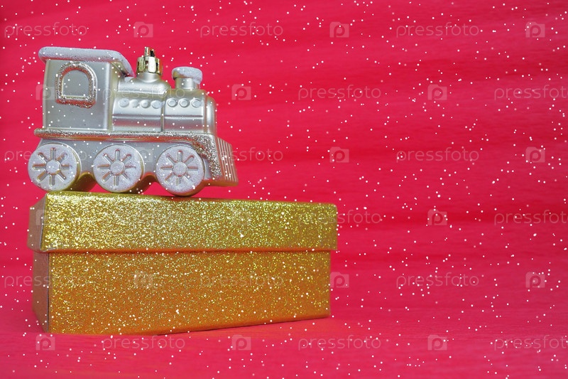 Золотой игрушечный паровозик и подарочная коробка на красном градиентном фоне. Новогодняя или рождественская открытка. Сосульки и снег на поезде. Свободное место для текста. Скопируйте пространство. Падающие снежинки