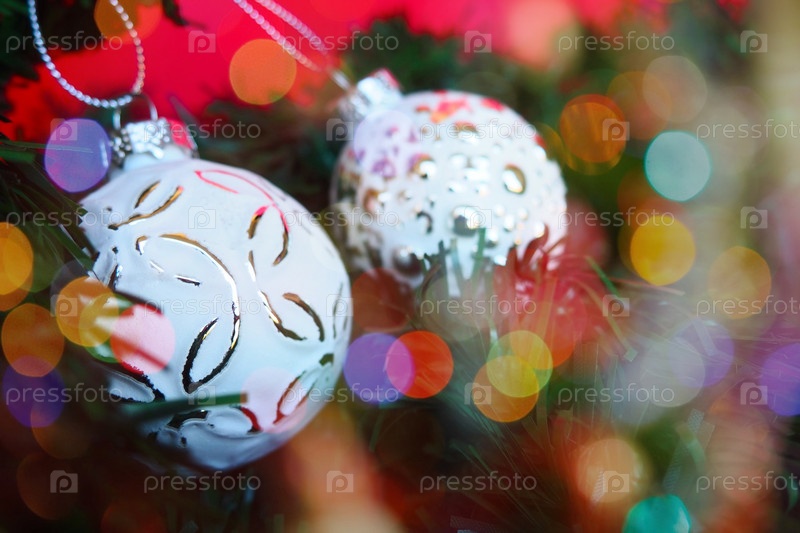 Белые модные елочные шары с посыпкой и узором на ветках елки. Разноцветное красивое боке вокруг украшений. Открытка или новогодний рождественский фон. Праздничное настроение