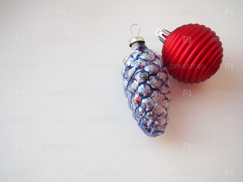 Новогодние и елочные игрушки и украшения на белом фоне. Конус сине-фиолетового стекла с декоративным белым снегом сверху. Красный полосатый новогодний шар