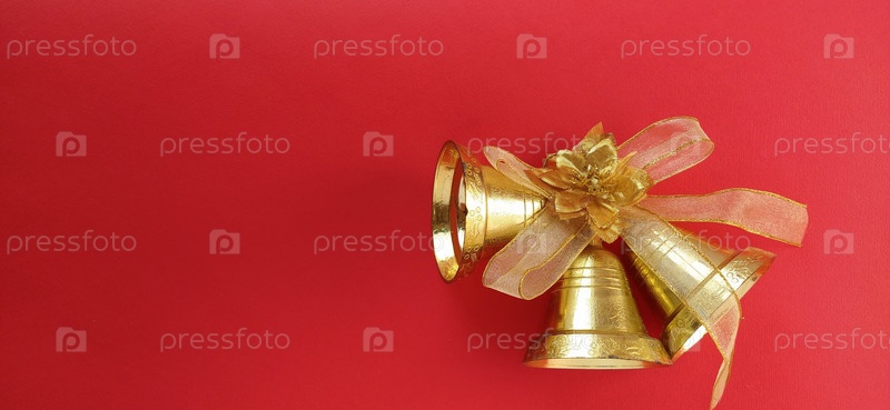 Рождественские украшения. Золотые колокольчики с лентой на красном фоне
