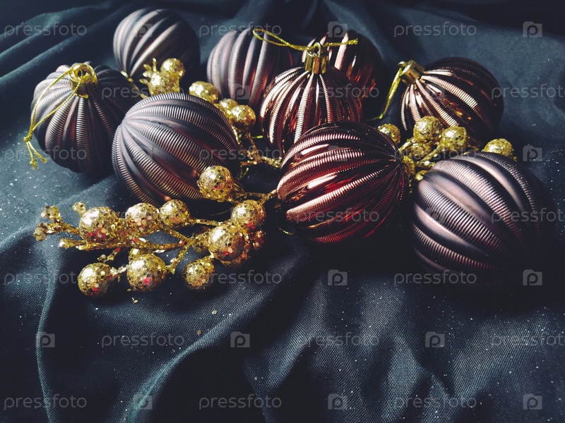 Открытка на новый год и рождество с украшениями, рождественскими украшениями и блестками на черном фоне. Коричневые блестящие полосатые шарики, цветы и белые снежинки, золотые веточки с ягодами