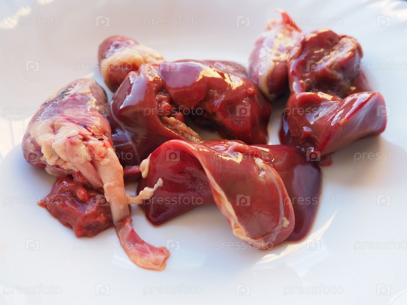 Сырая куриная печень, почки и сердце. Внутренности и субпродукты птицы, подготовленные для варки. Диета с высоким содержанием гемового железа против анемии. Мясо на белом фоне