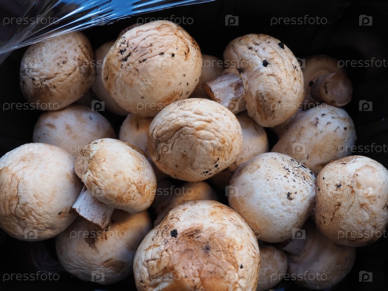 Шампиньоны в черной пластиковой упаковке. Бурые шампиньоны, выращенные на грибной фабрике. Грибы в открытой упаковке магазина. Крупный план грибов после разморозки. Срок годности еды