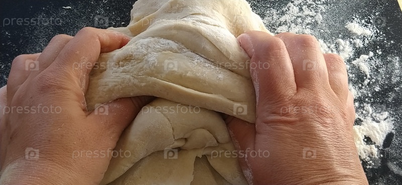 Руки месят тесто. Женщина месила тесто для выпечки или вареников. Подготовка муки, воды и яичной массы к термической обработке. Руки шеф-повара