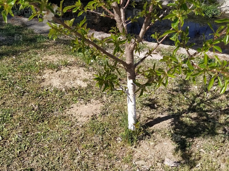 Молодая яблоня, ствол которой окрашен в белый цвет для защиты дерева от насекомых-вредителей ранней весной. На заднем плане канал с водой