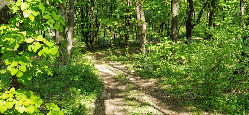 Грунтовая дорога в зарослях лиственных деревьев. Гора Фрушка, Сербия. Дикие места. Обильная растительность весной или в начале лета. Балканская природа. Извилистый путь. Баннер