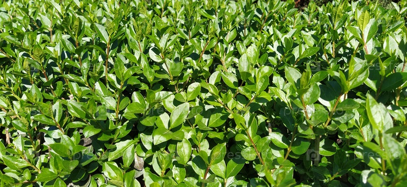 Зеленые кустарники. Живая изгородь. Яркая свежая листва. Глянцевые блестящие листья. Солнечное освещение. Городской парк. Украшение сада