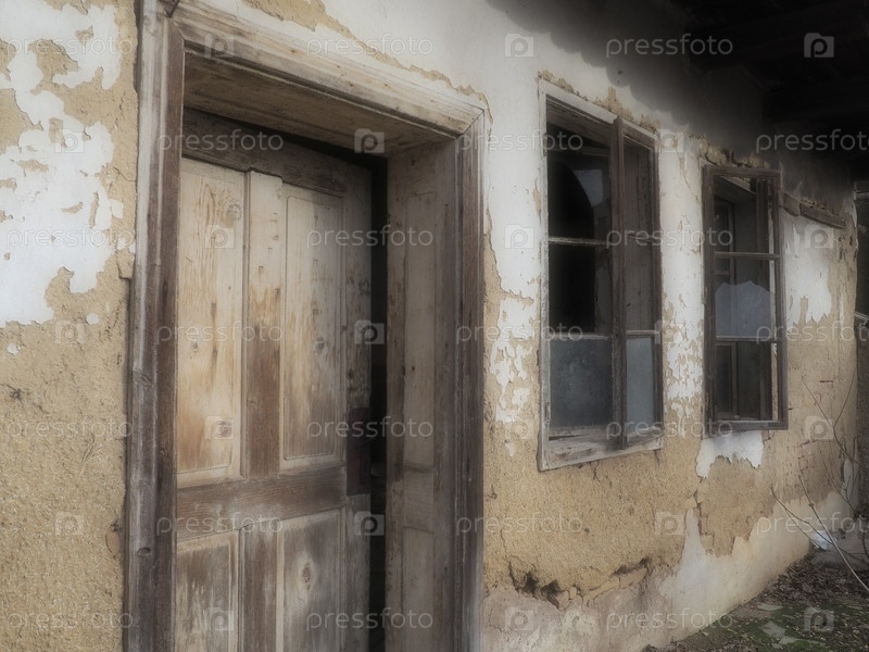 Старый дом с окнами и дверью. Разрушающийся сельский дом. Концепция урбанизации и забвения Родины. Заброшенный дом. Битые стекла в окнах и падающая штукатурка. Сербия. Балканы