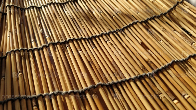 Соломенная подстилка, скатерть или небольшой коврик, разложенный на столе и сфотографированный сбоку. Мягкий вечерний солнечный свет отражается от стеблей. Некоторые палочки сломаны, нитки и веревки сплетены