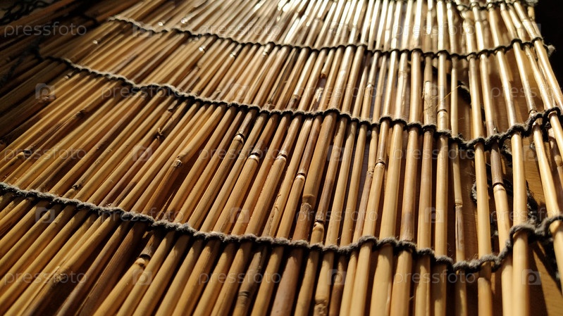 Соломенная подстилка, скатерть или небольшой коврик, разложенный на столе и сфотографированный сбоку. Мягкий вечерний солнечный свет отражается от стеблей. Некоторые палочки сломаны, нитки и веревки сплетены