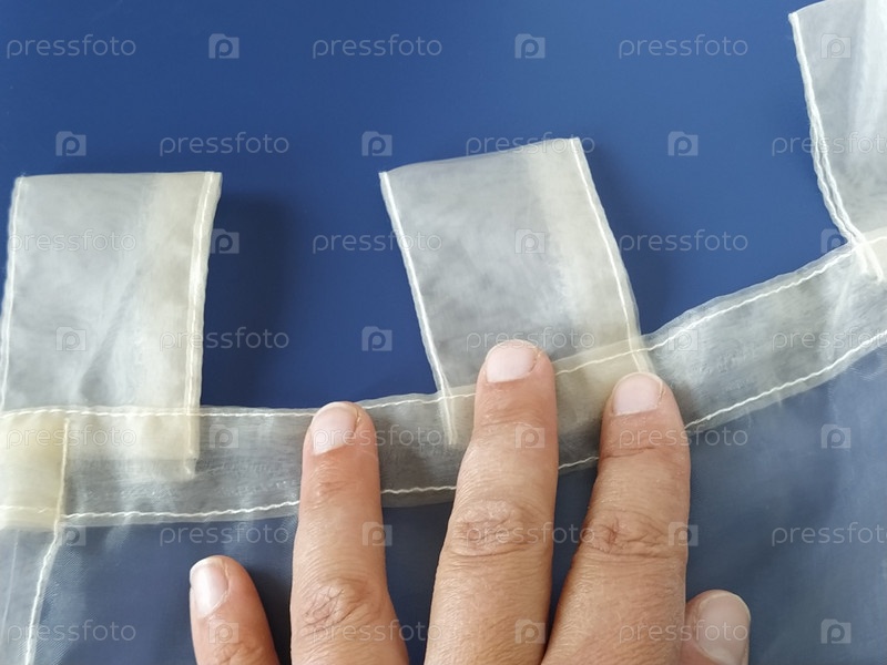 Рука швеи на прозрачной органзе. Петли на тюлевой занавеске. Пошив штор. Синий фон