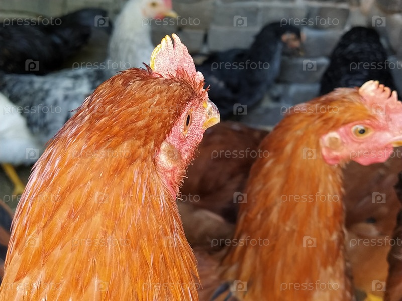 Портрет рыжего петуха. Птица с рыжей бородой и расческой, крупным планом. Коричневые перья у курицы. Птицеводство на ферме. Курица отворачивается от камеры и смотрит в глубину сарая