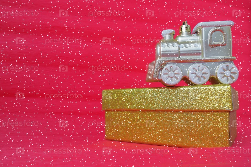 Золотой игрушечный паровозик и подарочная коробка на красном градиентном фоне. Новогодняя или рождественская открытка. Сосульки и снег на поезде. Свободное место для текста. Скопируйте пространство. Падающие снежинки