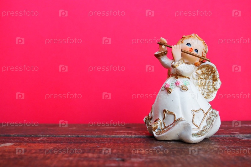 Ангел-хранитель играет на флейте. Фигурка рыжеволосой девушки в белом платье с крыльями и трубкой. Новогодний или рождественский праздник фон. Скопируйте пространство. Розовый деревянный фон. Свободное место для текста