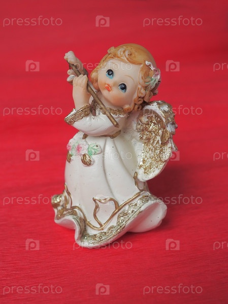 Ангел-хранитель играет на флейте. Фигурка рыжеволосой девушки в белом платье с крыльями и трубкой. Новогодний или рождественский праздник фон. Скопируйте пространство. Розовый фон. Свободное место для текста