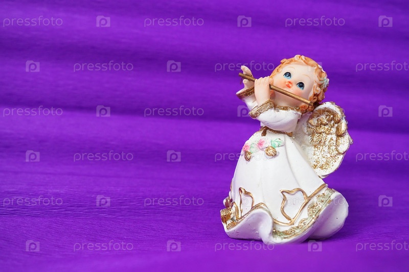 Ангел-хранитель играет на флейте. Фигурка рыжеволосой девушки в белом платье с крыльями и трубкой. Новогодний или рождественский праздник фон. копирайт. Фиолетовый фон. Свободное место для текста