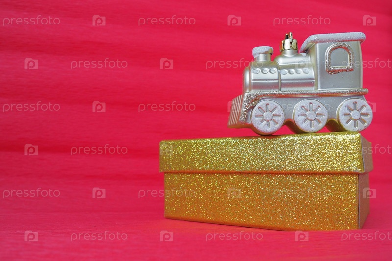 Золотой игрушечный поезд локомотив и блестящая подарочная коробка на красном и розовом градиентном фоне. Новогодняя или рождественская открытка. Сосульки и снег на поезде. Свободное место для текста. Скопируйте пространство