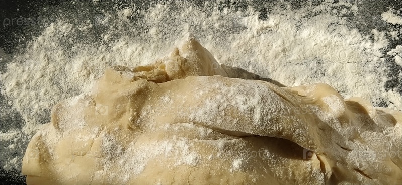 Процесс замеса теста. Кусок пшеничного теста с посыпанной мукой на черном фоне. Боковое освещение. Процесс приготовления хлеба
