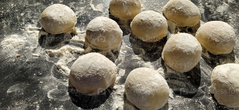 Круглые кусочки песочного теста для приготовления печенья или пряников. Сырые булочки или пельмени с разбросанной мукой на черном фоне