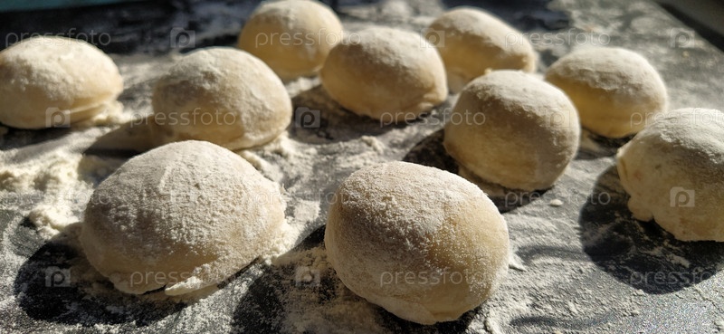 Круглые кусочки песочного теста для приготовления печенья или пряников. Сырые булочки или пельмени с разбросанной мукой на черном фоне
