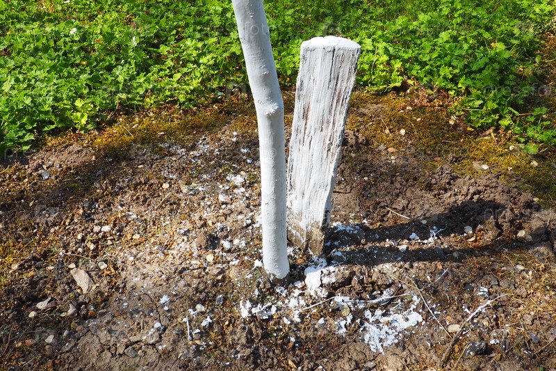 Весенние работы в саду. Побелка деревьев весной. Молодое дерево белят для защиты от грызунов. Молодые саженцы фруктовых деревьев и деревянный брусок, вкопанный в землю