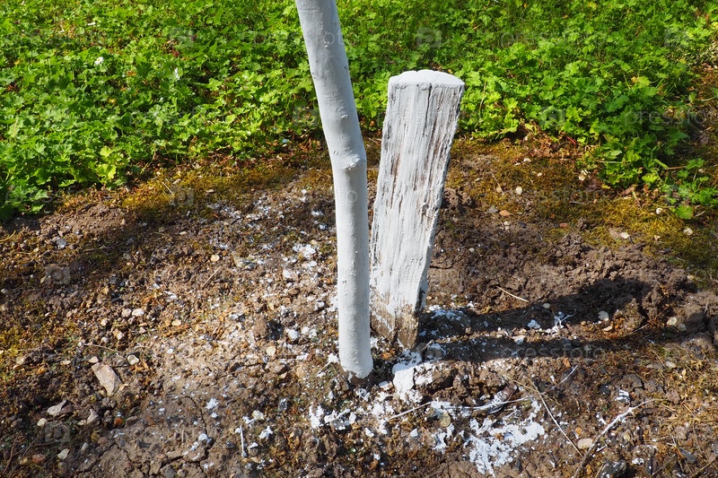 Весенние работы в саду. Побелка деревьев весной. Молодое дерево белят для защиты от грызунов. Молодые саженцы фруктовых деревьев и деревянный брусок, вкопанный в землю