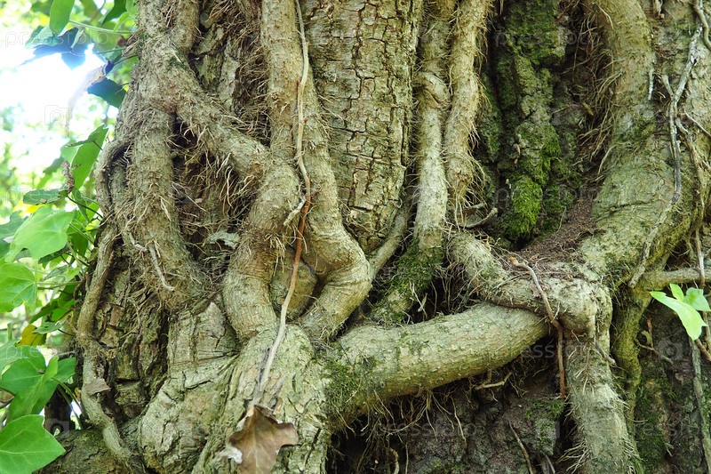 Стрельцы на ветвях деревьев в европейском лесу. Сербия, Национальный парк Фрушка Гора. Растение, которое находит вертикальную опору. Усыпы, вспомогательные корни, прикрепления. Лиана это жизненная форма растений