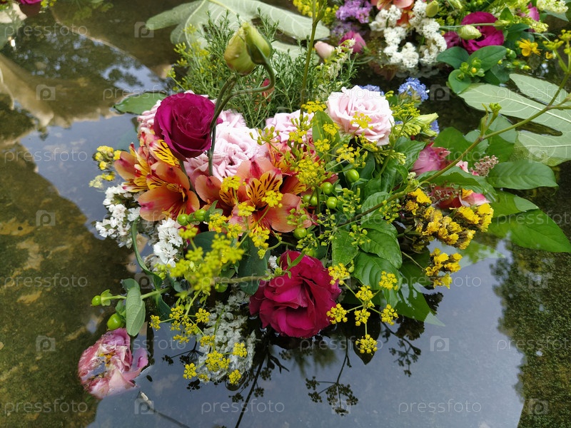 Розовые и красные розы в букете, плавающие в воде фонтана. Сорванные бутоны как украшение для летнего отдыха. Иван Купала, летнее солнцестояние. Праздник урожая