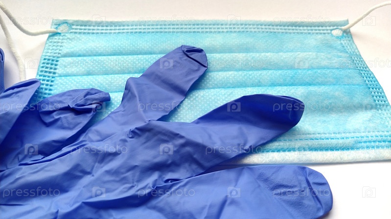 COVID-19. коронавирус. медицинские латексные перчатки и защитная синяя хирургическая маска на белом фоне. защита от биологической опасности. тестовый комплект. изображение или фон с медицинской тематикой. голубая тонкая перчатка