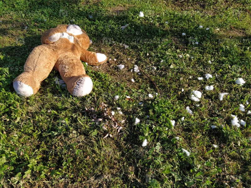 Ненужная забытая игрушка на траве. Порванный плюшевый мишка лежит на земле. Концепция насилия и забывчивости. Из груди медведя видна белая вата. Наполнитель вокруг игрушки