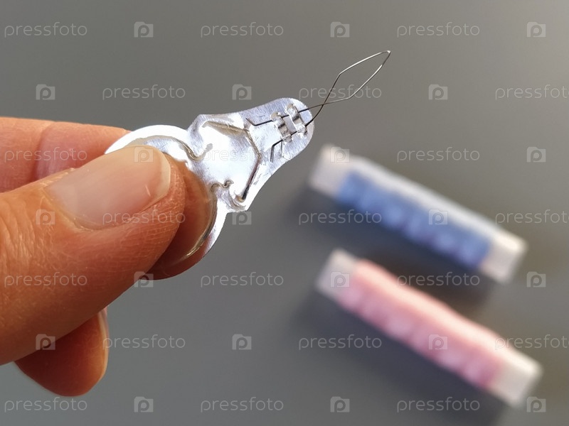 Приспособление для протягивания нити в игольное ушко. Бобины с голубыми и розовыми нитками на заднем плане. Женщина держит в руке нитевдеватель и показывает его тонкое проволочное ушко