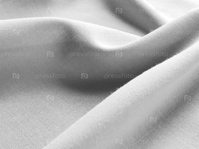Красиво сложенная ткань. Мягкие приятные волны и воланы на текстиле. Крупный план. Драпировка для штор, ткань для пошива одежды или обивки. Черно-белое монохромное изображение