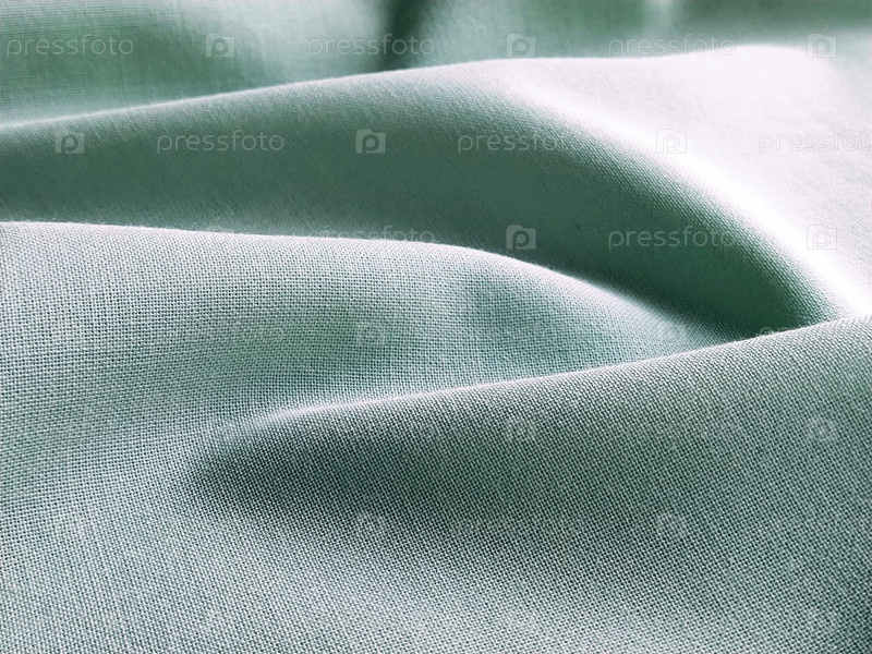 Красиво сложенная светло-зеленая ткань. Мягкие приятные волны и воланы на текстиле. Крупный план. Драпировка для штор, ткань для пошива одежды или обивки