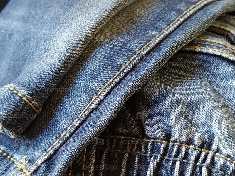 Джинсовая ткань со швами, выполненными красными или бежевыми нитками крупным планом. Текстильная текстура. Синий цвет материала. Швейное изделие легкой промышленности. Модные элементы на джинсах
