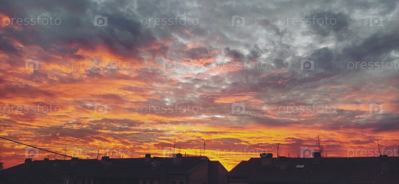 Драматические красивые облака во время заката. Кучевые облака подсвечиваются оранжевым и розовым цветом. Темные и серые тона. Баннер. Нежные пастельные тона. Облака над крышами города