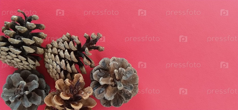 Конусы на красном фоне. Несколько еловых или сосновых шишек слева. Новогодняя или рождественская тема. Баннер