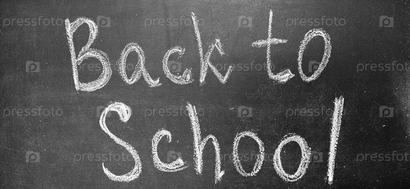 Снова в школу написано от руки белым мелом на доске. Черно-белая монохромная фотография. Буквы и слова. Напоминание и приглашение для студентов на новый учебный год