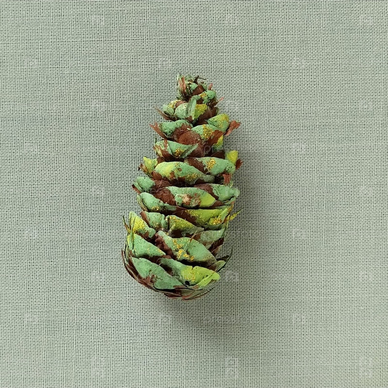 Красивая сосновая шишка, окрашенная в зеленый цвет, украшенная золотыми блестками. На заднем плане светло-зеленая ткань. Скопируйте пространство. Рождественские мотивы