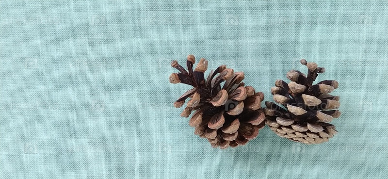 Две сосновые или еловые шишки на зеленом фоне. Коричневые шишки лежат в середине кадра, с небольшой тенью. На заднем плане светло-зеленая шерстяная ткань с видимым плетением. Баннер