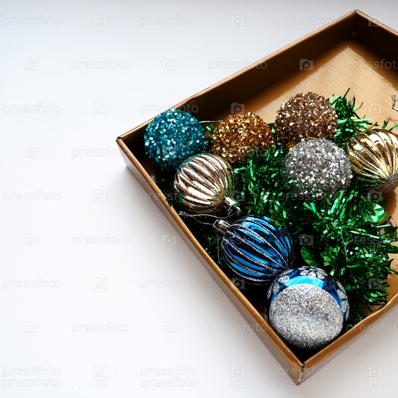 Модные елочные украшения, разноцветные шарики и мишура в крышке подарочной коробки. Блестящая бежевая или коричневая коробка для подарков или хранения. Новогодняя рождественская открытка. Скопируйте пространство. белый фон