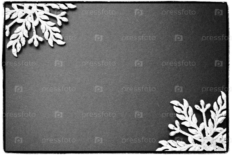 Новогодний или рождественский фон с двумя декоративными снежинками по краям листа цветной бумаги. Скопируйте пространство. Рамка, белые серебряные снежинки на черном фоне