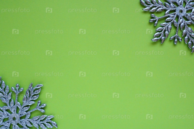 Новогодний или рождественский фон с двумя декоративными снежинками по краям листа цветной бумаги. Скопируйте пространство. Синие серебряные снежинки на зеленом фоне