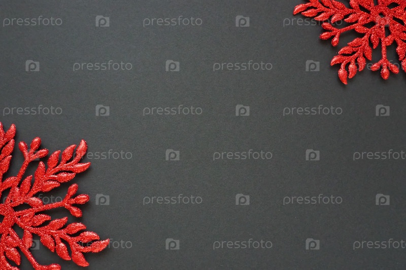 Новогодний или рождественский фон с двумя декоративными снежинками по краям листа цветной бумаги. Скопируйте пространство. Ярко-красные снежинки на черном фоне
